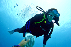ダイビング中は、ガイドが水面や水中で「目が届く」「手が届く」「声が届く」距離でサポートします。